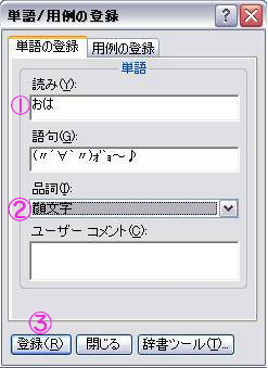 ③左下の登録(A)のボタンを押せば顔文字登録完了です。